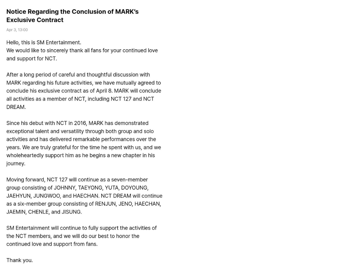 In a statement released on April 3, SM Entertainment said the decision followed mutual agreement after extensive discussions. Mark’s exclusive contract will conclude next Wednesday, and he will no longer participate in NCT 127, NCT Dream or any related projects.