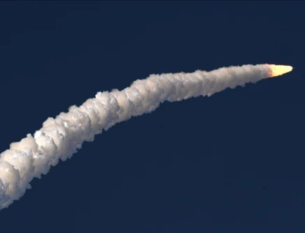 A view of the Artemis II rocket as it blasts off into space, leaving behind a trail of white smoke. PHOTO: ANADOLU AGENCY
