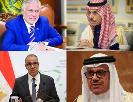 A combination of photos featuring Deputy Prime Minister and Foreign Minister Ishaq Dar, Saudi Foreign Minister Faisal bin Farhan bin Abdullah, Egypt’s counterpart Badr Abdelatty, and Bahraini Foreign Minister Abdullatif bin Rashid Al Zayani. Photo: AFP/ Reuters