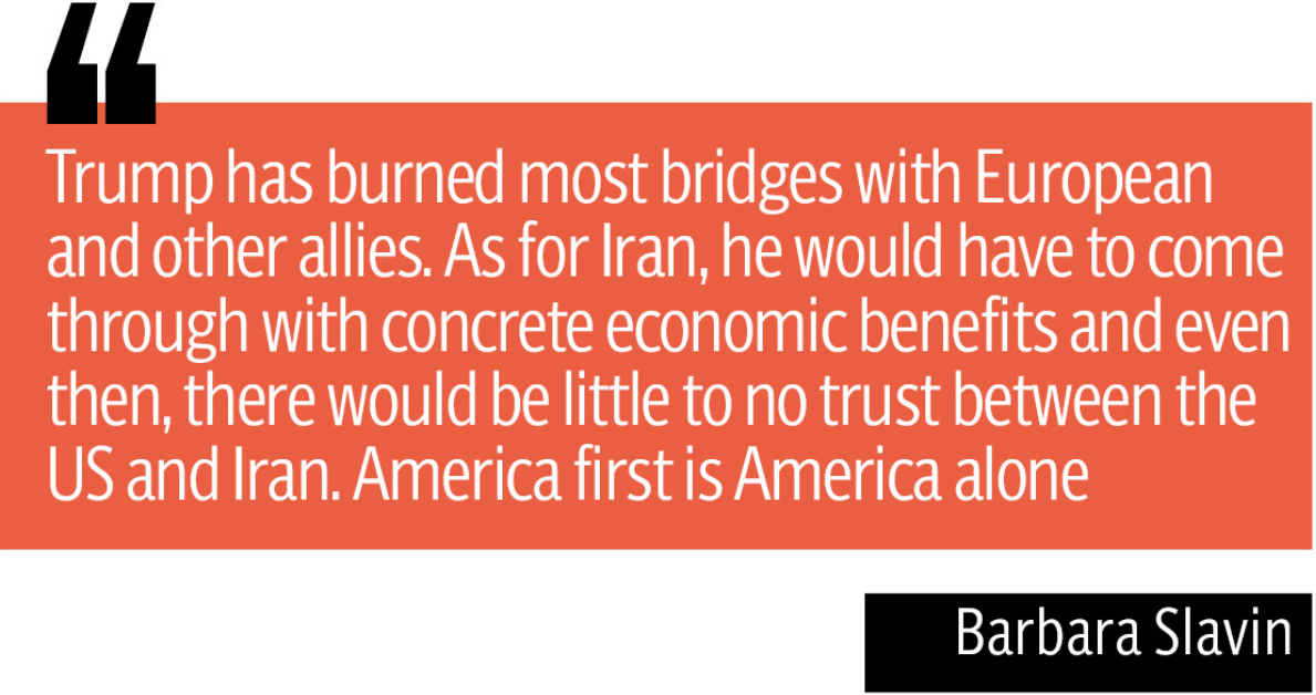 Adding further caution, Slavin said the “America First” strategy has left the US isolated. “The president has burned most bridges with European and other allies. As for Iran, he would have to come through with concrete economic benefits, and even then, there would be little to no trust between the US and Iran.”