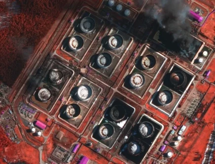 A satellite near-infrared image shows smoke rising from damaged oil storage tanks as they burn after a Ukrainian attack in Primorsk, Russia. PHOTO: REUTERS