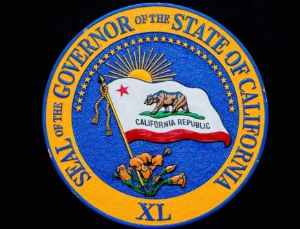 The Seal of the Governor of the State of California is displayed on a podium prepared for Governor Gavin Newsom ahead of his expected press conference in San Diego, California, U.S., February 2, 2026. REUTERS