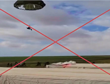The comparison also shows the same parachute, with distinct holes visible in its canopy, appearing in both videos. This unique feature further confirms that the footage is identical and has been misrepresented with a false claim.
