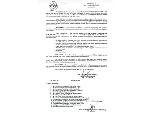 According to a notification, Deputy Commissioner Rawalpindi Hassan Waqar Cheema, citing the law and order situation, imposed Section 144 of the Code of Criminal Procedure (CrPC) within the district from April 6 to April 20.