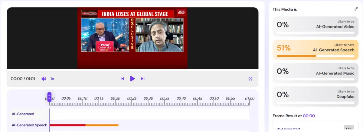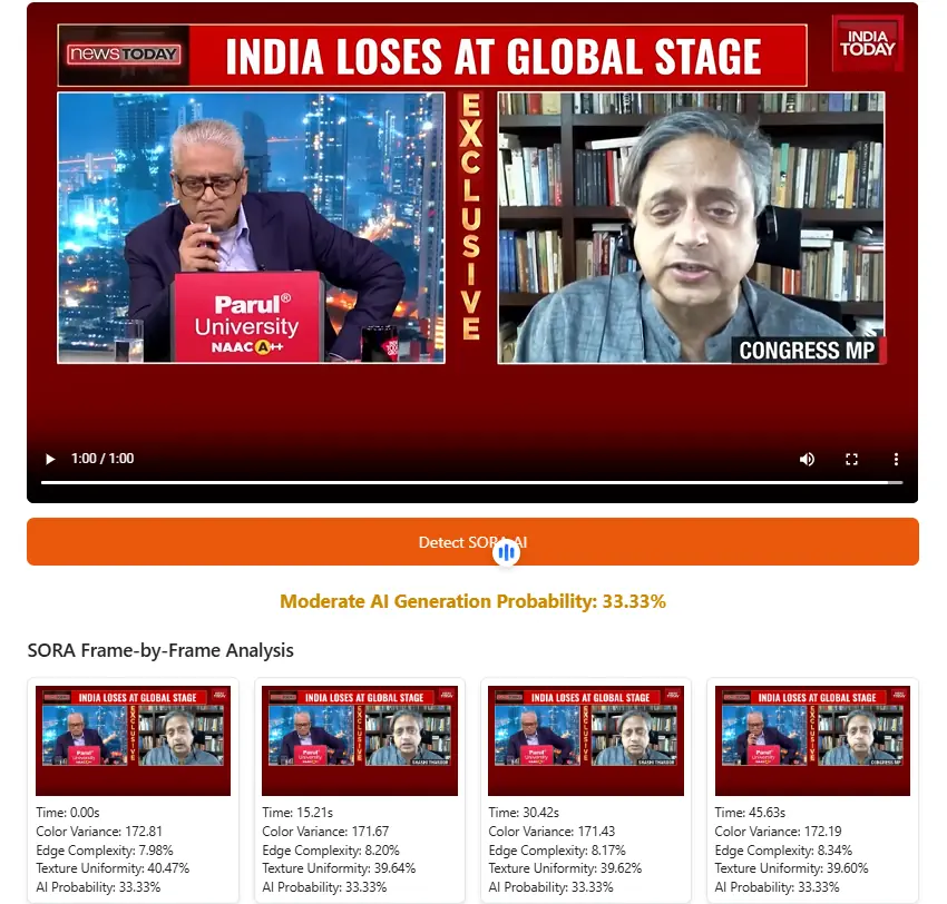 Inspecting the video revealed several visual and audio discrepancies: Tharoor’s tone and delivery in the viral clip were inconsistent with his normal way of speech and appeared robotic, with unnatural pacing, abrupt pauses and awkward emphasis on certain words.