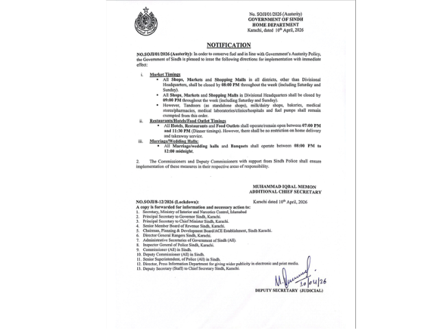 The Sindh government announced new operating hours for markets, restaurants, and wedding halls on Friday under austerity measures aimed at coping with the fuel crisis amid tensions in the Middle East, according to a notification issued by the home department.