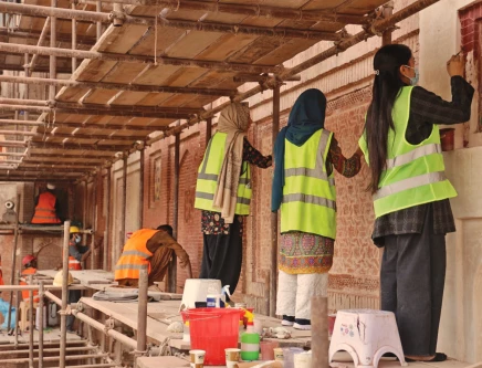Restoration work at the Wazir Khan Mosque includes structural consolidation of domes, walls, and foundations, along with repairs to floors, lime plaster, rooftops, and parapets.