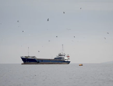 A vessel at the Strait of Hormuz, off the coast of Oman’s Musandam province, April 12, 2026. PHOTO: REUTERS