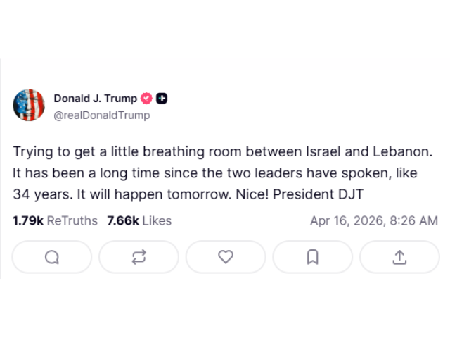 US President Donald Trump said in a Truth Social post that the leaders of Israel and Lebanon will speak for the first time in 34 years on Thursday, as he claims he is "trying to get a little breathing room between Israel and Lebanon."