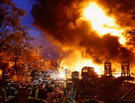 Firefighters work at the site of a recyclable materials warehouse hit by a Russian missile strike, amid Russia's attack on Ukraine, in Kyiv, Ukraine April 16, 2026. PHOTO: REUTERS
