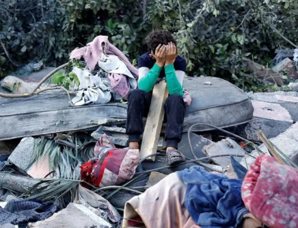 A Palestinian boy reacts as he sits at the site of an overnight Israeli strike on a house, in Nuseirat, central Gaza Strip, October 29, 2025.PHOTO: REUTERS