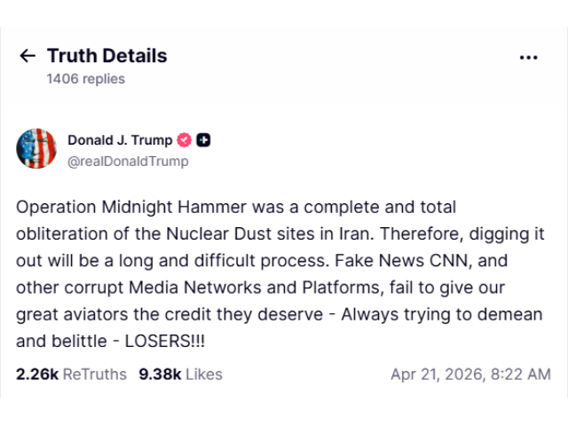 "Operation Midnight Hammer was a complete and total obliteration of the Nuclear Dust sites in Iran," Trump said, referring to the June 2025 strikes he ordered on Iran's nuclear facilities. The US president has long maintained that the attacks "obliterated" Iran's nuclear program, and has recently referred to the uranium stockpile as "dust."