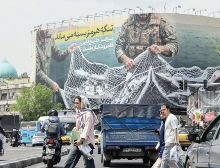 Iranian walks past a giant billboard reading ‘The Strait of Hormuz remains closed’ at Revolution Square in Tehran. Photo: AFP