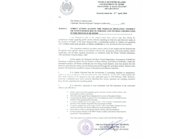 Sindh government on Thursday ordered a crackdown on public service vehicles operating without "valid route permits and fitness certificates or with documents that have expired", according to an official notification issued by the provincial Transport and Mass Transit Department.