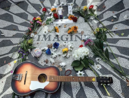 A guitar, flowers, and other tokens lie on the Imagine mosaic on the 45th anniversary of John Lennon’s death in the Strawberry Fields section of Central Park in New York City, in December. Photo: REUTERS