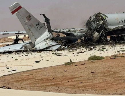 This UGC image posted on social media on March 29, 2026 and verified by AFP staff appears to show a destroyed US Air Force Airborne Warning and Control System (AWACS) aircraft, primarily used for air traffic control, in the aftermath of a projectile strike at Prince Sultan Airbase in Saudi Arabia. (UGC / AFP)