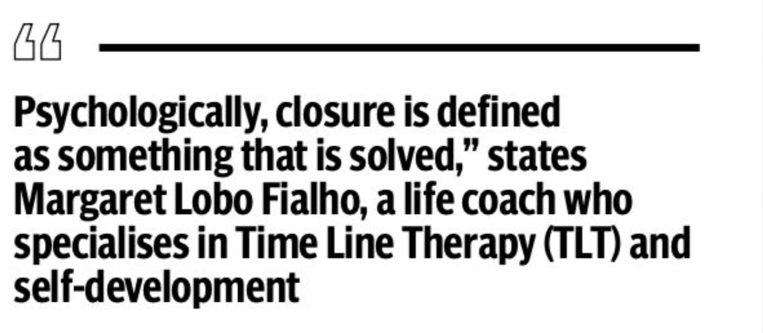 “Psychologically, closure is defined as something that is solved,” states Margaret Lobo Fialho, a life coach who specialises in Time Line Therapy (TLT) and self-development. “[It is defined as] a closed chapter—a sense of a need for resolution and understanding in the emotional sense.”
