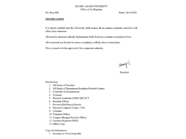 Quaid-e-Azam University, in a notification issued on Sunday, announced that all on-campus academic activities will resume from Monday. However, it added that all austerity measures already implemented will continue to remain in place.