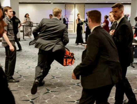 A security official runs with a bag as a shooter opens fire during the annual White House Correspondents' Association dinner in Washington, D.C., U.S., April 25, 2026. PHOTO: REUTERS