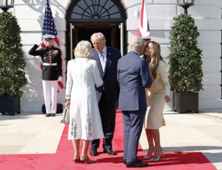 The king, sporting a navy suit, and the queen, wearing a pink dress, stood on the tarmac while a military band played the British and US national anthems, before they headed to the White House for a private meeting with self-proclaimed royal fan President Donald Trump.