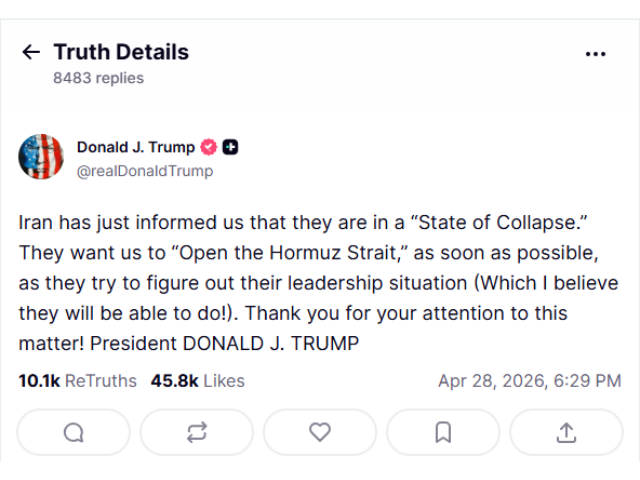 In a Truth Social post on Tuesday, Trump said: "Iran has just informed us that they are in a 'State of Collapse'. They want us to 'Open the Hormuz Strait,' as soon as possible, as they try to figure out their leadership situation (Which I believe they will be able to do!)."