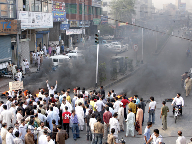 Hundreds of traders blocked the main boulevard near Main Market, M M Alam Road, Nisbet Road and Australia Chowk for nearly two hours. Sporting anti-government banners, the protesters chanted slogans against the federal regime and burnt tyres.