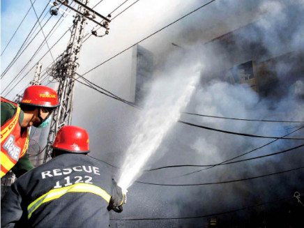 Firefighters extinguish fire that erupted in a store in Faizabad. PHOTO: ONLINE