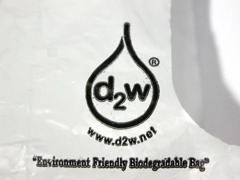 The oxo biodegradable bags come with a logo — “d2w,” a brand for biodegradable plastic, inscribed in a water drop.