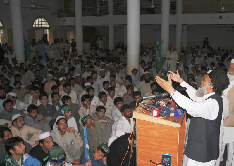 JI chief Syed Munawar Hasan’s addressed a political gathering in a mosque on University Road in Peshawar Wednesday afternoon. PHOTO: Iqbal Haider
