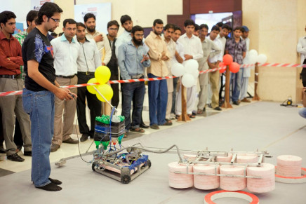 An exhibition of robotics skills was underway, with young graduates from different universities showing off their projects. Zafeer, one of the team members who is to appear in the Robocon 2013 competition in Vietnam, was demonstrating an air pressure-based eight-metre projectile which would jump to its destination when pushed.