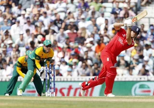 England captain Alastair Cook (R) plays a shot during the One Day International (ODI) ICC Champions Trophy match between England and South Africa at the Oval. PHOTO: AFP