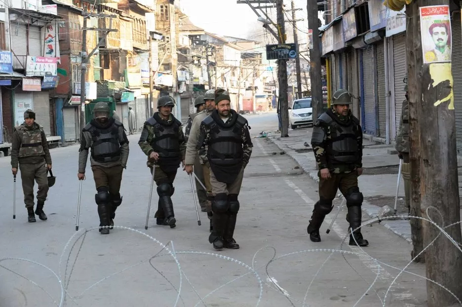 Indian police patrol on a street in Srinagar on February 10, 2013. PHOTO: AFP