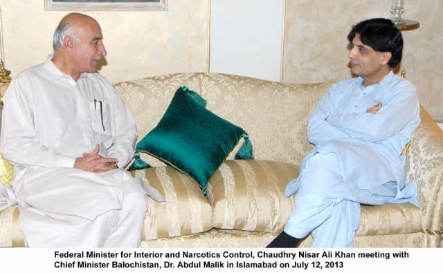Balochistan chief minister Abdul Malik Baloch (L) speaks with Interior Minister Chaudhry Nisar Ali Khan. PHOTO: PID