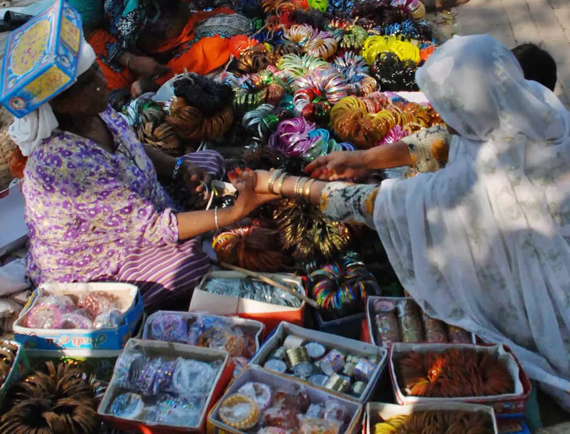A woman selling bangles at her set up in Sunday Bazar. PHOTO: INP