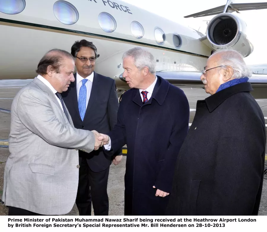 Nawaz Sharif being received by a representative of the British Foreign Secretary after his arrival in London. PHOTO: PID