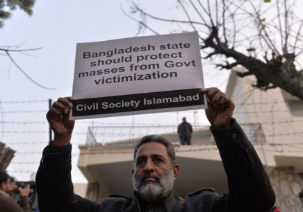 A Pakistani civil society activist holds up a placard during a protest against the execution of Bangladeshi Islamist leader Abdul Quader Molla, outside the High Commission of Bangladesh, in Islamabad on December 17, 2013. PHOTO: AFP