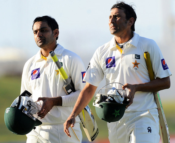 Mohammad Hafeez (L) and Younis Khan leave the pitch at close of play on the final day of the first cricket Test match between Pakistan and Sri Lanka at the Sheikh Zayed Stadium in Abu Dhabi on January 4, 2014. PHOTO: AFP