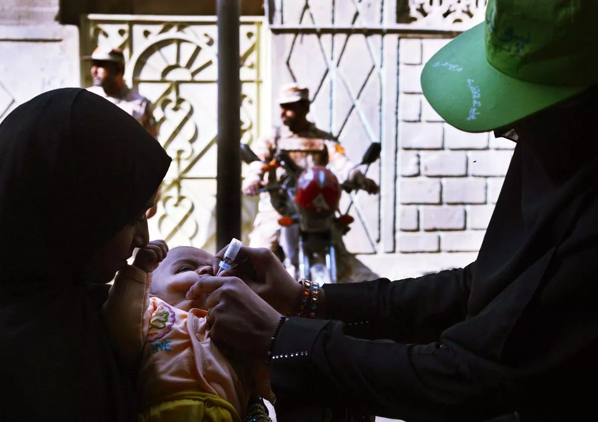 A polio vaccination worker administers polio vaccine drops to an infant as paramilitary soldiers stand guard. PHOTO: AFP/FILE