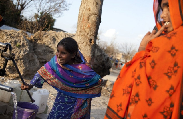 A young woman uses a hand pump to fill water for daily use near her home at a katchi abadi in Islamabad. PHOTO: MUHAMMAD SAQIB