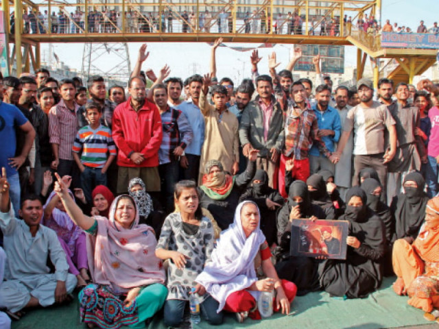 Family and hundreds of other people protested against Zeeshan’s “extrajudicial killing” outside the New Karachi police station as well as in Nagan Chowrangi on Saturday. PHOTO: PPI
