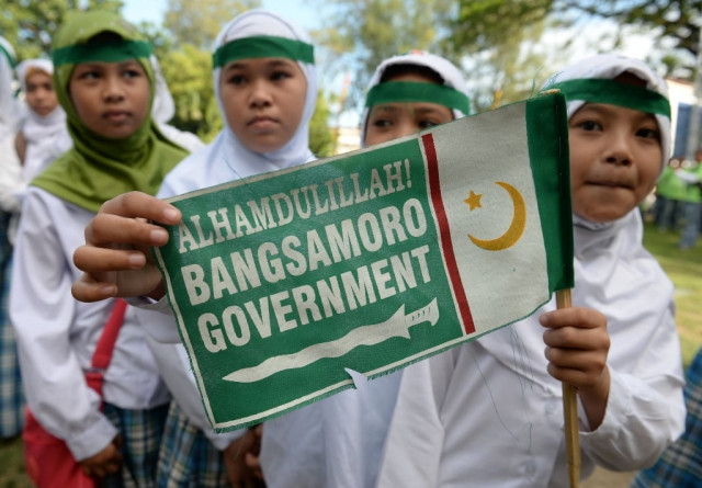 Young Muslims hold a Moro Islamic Liberation Front (MILF) miniature flag as they gather for a rally in support of the peace agreement with the government in Cotabato City, on the southern island of Mindanao on March 27, 2014. PHOTO: AFP