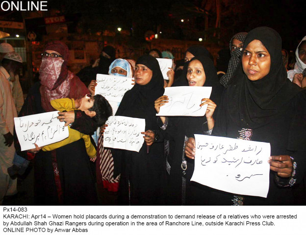 Women hold up names of their relatives who were detained by Rangers during an operation in Ranchore line. HRCP says 44 people were killed by paramilitary soldiers netweem January and March. PHOTO: ONLINE