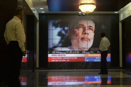 In this photograph taken on May 16, 2014, Indian passers-by watch an image of Bharatiya Janata Party (BJP) prime ministerial candidate Narendra Modi on a digital broadcast screen at the entrance of the Bombay Stock Exchange (BSE) building in Mumbai. Bharatiya Janata Party leader and Hindu nationalist Narendra Modi stormed to victory at the polls in India's general election throwing the left-leaning secular Congress from office and handing his party a powerful mandate for promised sweeping reforms. PHOTO: AFP