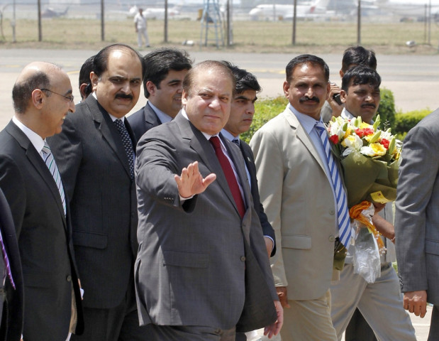 Prime Minister Nawaz Sharif waves upon his arrival at the airport in New Delhi May 26, 2014. PHOTO: REUTERS