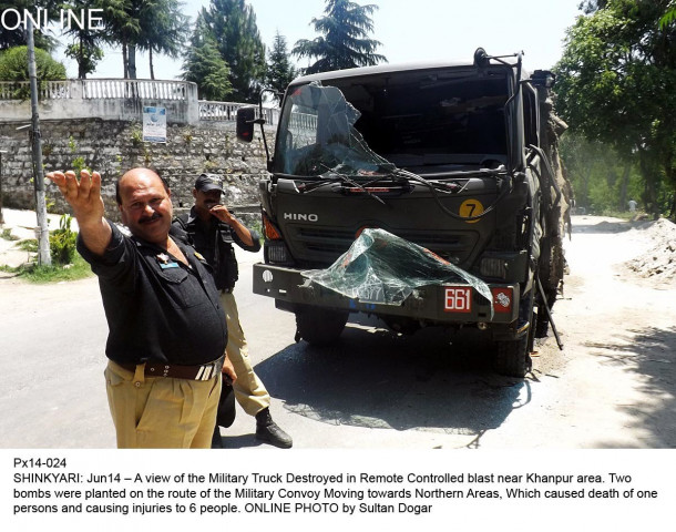 On Saturday, eight trucks carrying army personnel were on their way to Gilgit when the vehicle at the front, carrying four people, was attacked. An improvised explosive device (IED) had been detonated remotely, and the blast injured four military personnel severely.