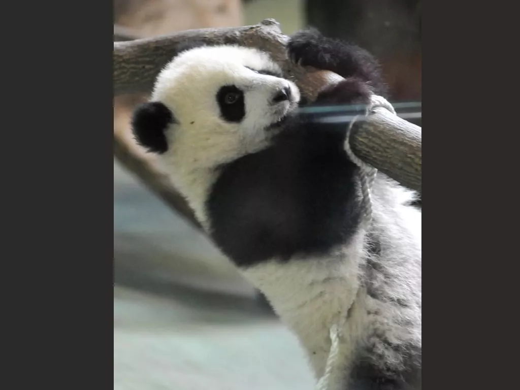 The main attraction was when the cub grabbed different cards in "Zhua Zhou", a traditional crawling game for one-year-old babies in many Chinese communities.