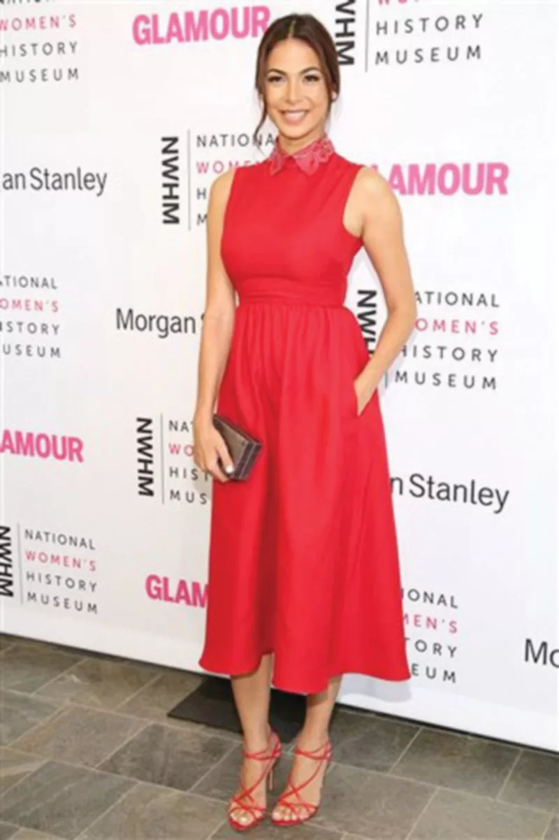 She looked glamorous in loose curls, bronze eye shadow and rose lips.