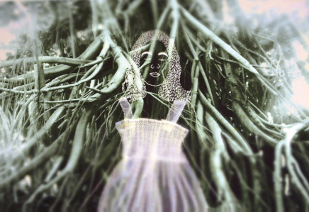 Showing embroidered surfaces shaping up into the figure of a girl, each of her pieces tells a story. Putting her passion for photography to use, she has printed the photos on large canvases and hand-stitched over them to add layers and textures.