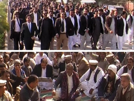 Scores of lawyers led by district bar president Salim Raza Kakar marched from Aiwan-i-Adal and staged a protest demonstration at Kutchery Chowk.