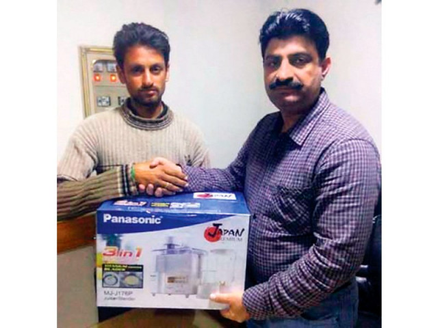 Rifaqat Ali of Kasur won a food factory on giving correct answers for Pakistan-West Indies match. Daily Express correspondent in Kasur Maher Javed handed over the prize to the winner.